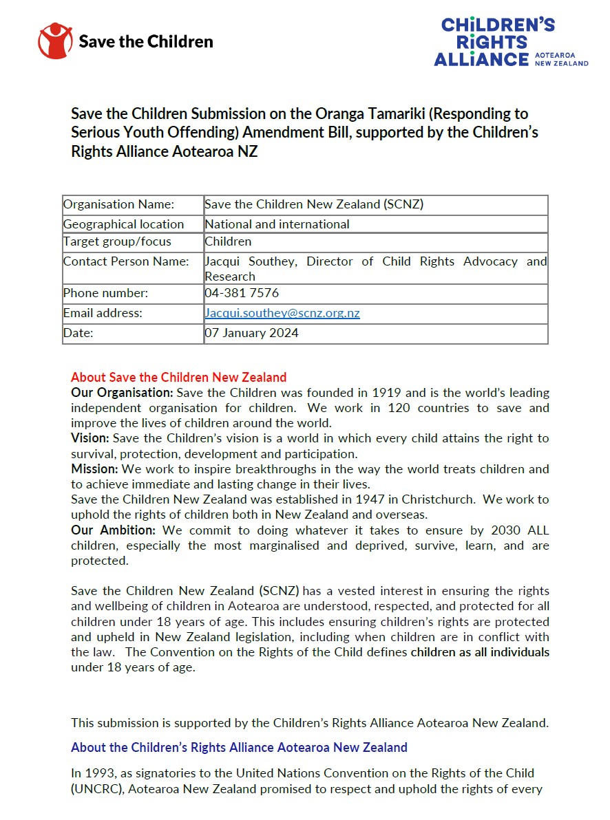 This submission by Save the Children New Zealand, supported by the Children’s Rights Alliance Aotearoa NZ, outlines concerns about the Oranga Tamariki (Responding to Serious Youth Offending) Amendment Bill. It highlights the potential harmful impact on vulnerable children aged 14-17, opposes the introduction of Young Serious Offender (YSO) declarations and Military Style Academies, and advocates for evidence-based, child-centered approaches to youth justice. The submission calls for the withdrawal of the Bill, emphasizing the importance of rights-based solutions and prevention-focused interventions.